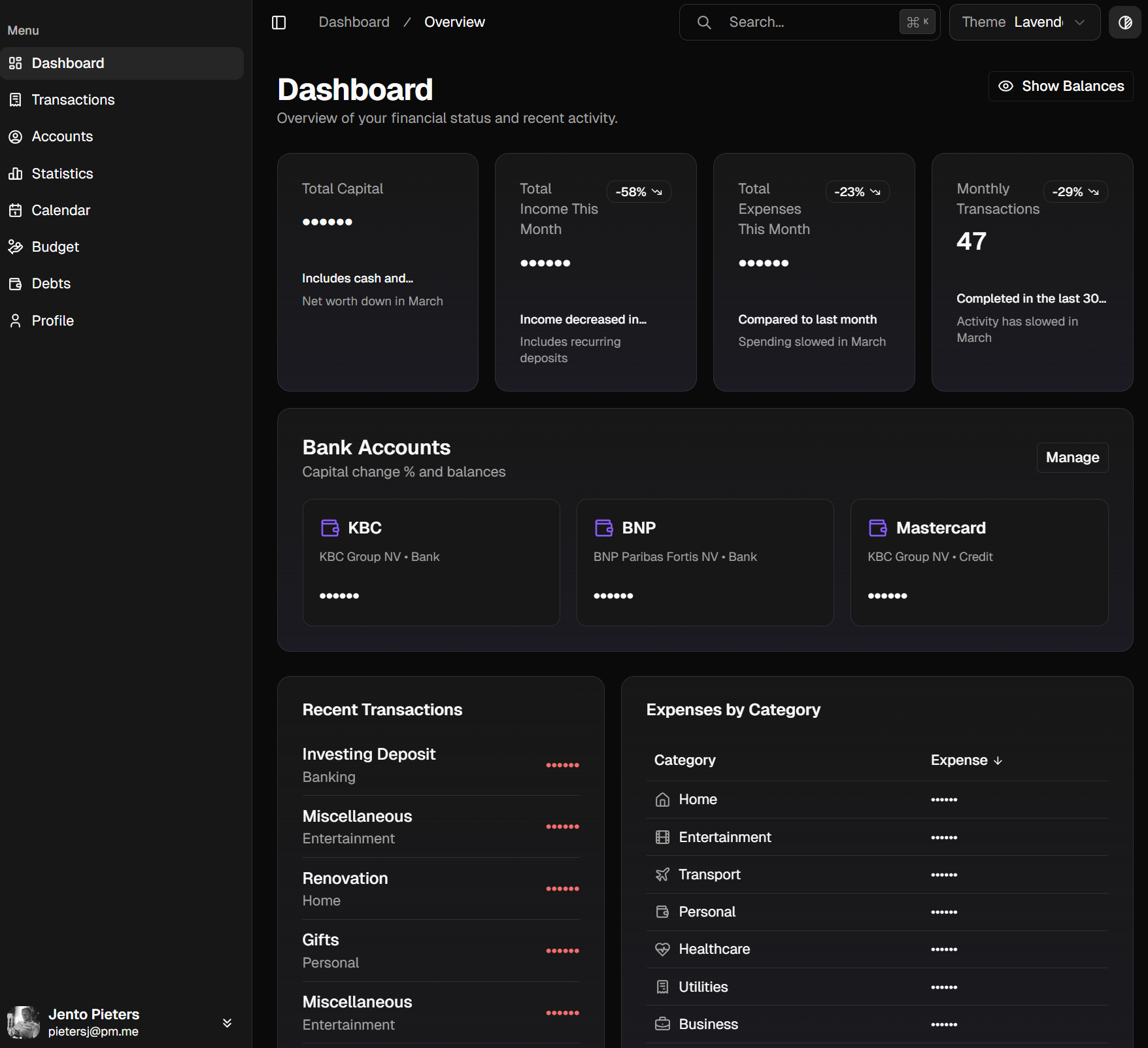 De huidige versie omvat een volledig dashboard met statistieken en grafieken, transactiebeheer met categorisatie, budgetmeting per categorie, schuldbeheer en uitgebreide aanpassingsopties voor het persoonlijke overzicht.
